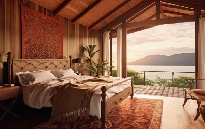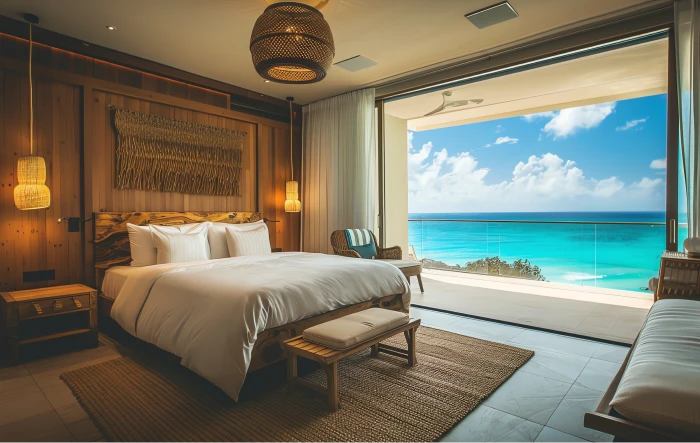 A Suíte Oceano Azul oferece uma experiência única à beira-mar, perfeita para quem busca relaxamento e sofisticação. Com uma varanda privativa que oferece uma vista panorâmica do oceano, você poderá desfrutar de belos amanheceres e pores do sol, enquanto sente a brisa suave do mar. O ambiente espaçoso combina um design moderno e aconchegante, pensado para proporcionar o máximo de conforto aos nossos hóspedes.